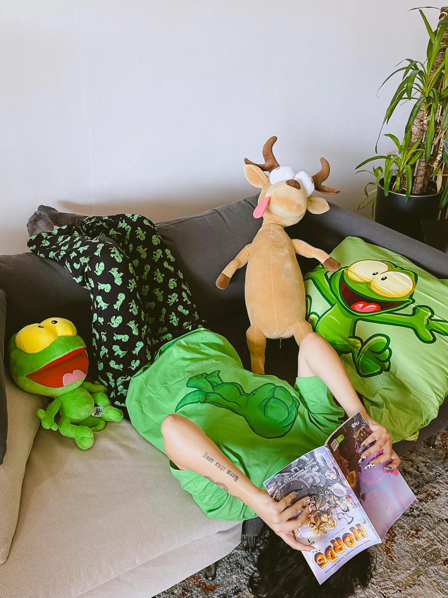 Die lange Hose trägt so viel Lurch, dass man sie eigentlich „Lurchliebe in Stoffform“ nennen könnte. Perfekt für kalte Nächte, faule Tage und alles dazwischen.